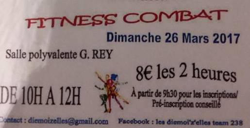 Nous vous proposons de participer à une matinée "FITNESS COMBAT" le dimanche 26 mars à Diémoz de 10h à 12h (Après avoir bien éliminé, vous pourrez consommer ou emporter des saucisses-frites).