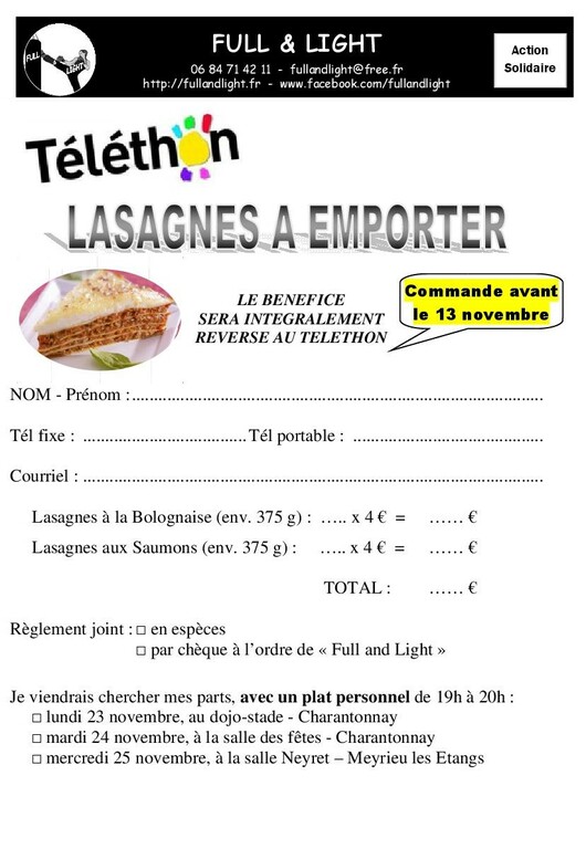 Lasagnes fraiches "bolognaise ou saumon" à emporter au profit du Téléthon : 4 € / la part