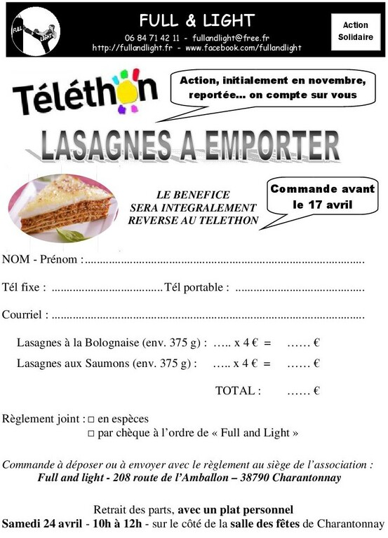 Lasagnes fraiches "bolognaise ou saumon" à emporter au profit du Téléthon : 4 € / la part (uniquement sur réservation)