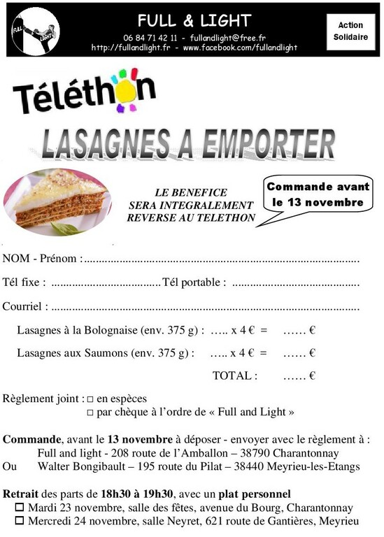 Lasagnes fraiches "bolognaise ou saumon" à emporter au profit du Téléthon : 4 € / la part (uniquement sur réservation)
