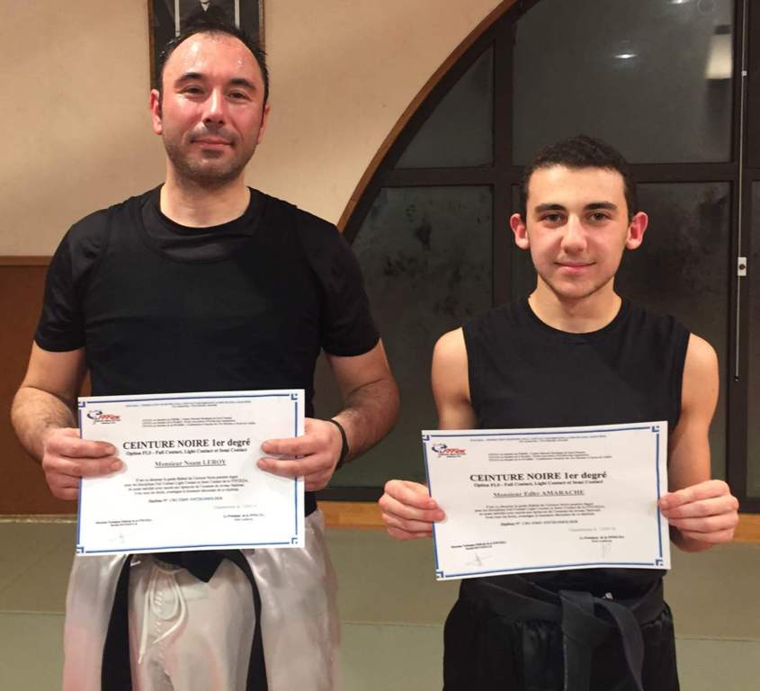 Ce lundi 21 mars, le bureau de l'association remettait officiellement leur ceinture noire et leur diplôme à Edhy Amarache et Noam Leroy, qui ont validé toutes les unités de valeurs du 1er dégré, lors du passage organisé par la Ligue Rhône Alpes de Full Contact Kickboxing et D.A. du samedi 12 mars. Pratiquants depuis plusieurs années, ils se sont préparés plusieurs semaines, tant physiquement que techniquement avec les conseils de 3 instructeurs fédéraux du club.