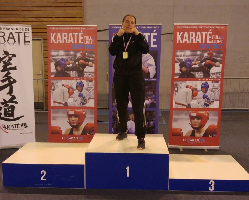 De retour de l'Open des Masters Karaté Light Contact à Melun... une première expérience avec la Fédération Française de Karaté. Stéphanie est partie seule, et après de la voiture-3 changements de train et re-de la voiture, est arrivée limite pour la pesée. Inscrite dans la catégorie Senior +70 kg (poids open au dessus des 70 kg), la catégorie compte 4 combattantes, représentant la Picardie, le Pays de Loire et l'Ile de France. Stéphanie gagne la demi-finale puis la finale, et finit ainsi sur la première place (la photo a du être prise en solo, car les podiums plus tardifs lui auraient fait louper ses trains pour revenir en Nord Isère). Un grand merci à toute l'équipe du club "Ecole des Serres de l'Aigle", Cathy Le-Mee, et Valérie Perrais pour leur gentillesse, accueil et aide.