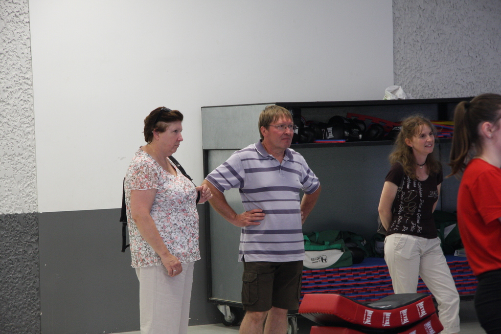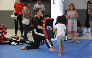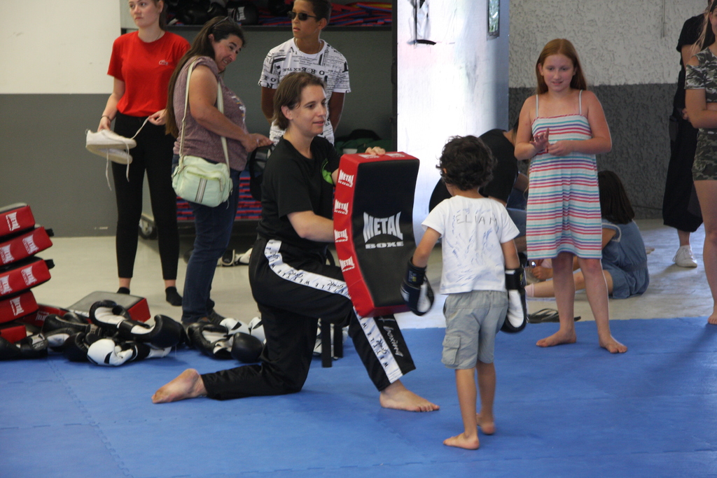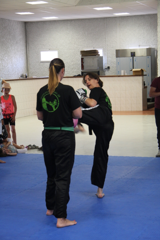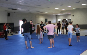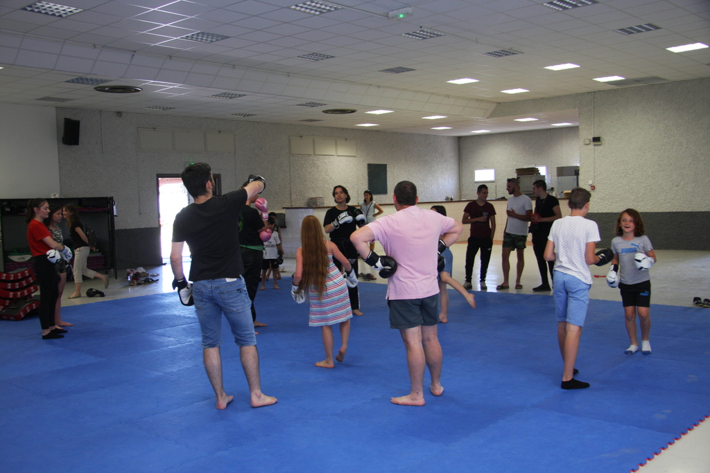 Dans la salle des fêtes, 2 cours d'initiation étaient proposées... pas trop de participants, mais de beaux sourires, et des mentalités qui évoluent... la boxe pieds-poings, ce n'est pas juste se taper dessus. Merci à Gaelle, Richard toujours présents et Mathéo.