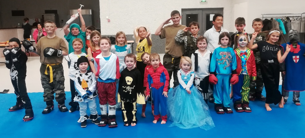 Comme Mardi Gras est une fois de plus pendant les vacances scolaires, les moniteurs de l'association invitaient les groupes Kids et Jeunes à venir s'entrainer déguisés ce mardi. Il y avait un clown, un pirate, des militaires, un chirurgien, une chinoise.... A la fin du cours chacun s'illustrait par quelques mouvements de boxe pieds-poings devant les autres enfants. Ces derniers, avec leurs fratries et leurs parents se retrouvaient ensuite autour d'un goûter - apéritif, ou crêpes et gaufres étaient rapidement englouties. Le cours Ados-Adultes, puis celui de Préparation Physique, prenaient aussi le temps de partager un verre et grignoter.