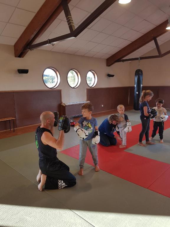 Sous forme de jeux, les enfants apprennent à s'échauffer, développent des capacités motrices, telles que la coordination, l'équilibre, le contrôle... et se relaient avec les parents sur des exercices de renforcement et d'étirement. Le premier cours à eu lieu ce lundi, et 6 petits se sont présentés accompagnés et ont enchaîné des frappes sur des ballons de baudruche, des coups de pied sur cible sans tomber dans la rivière, la défense de leur caverne...