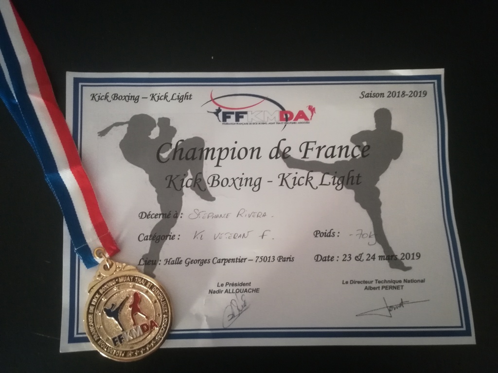 Près de 48 h après être partie pour la Capitale, Stéphanie s'octroit le titre de Championne de France de Kick Light en vétéran -70 kg, avec une adversaire proposant une belle technique, mais un peu moins d'enchaînements et de tactique. Un joli combat sans aucune intervention de l'arbitre.