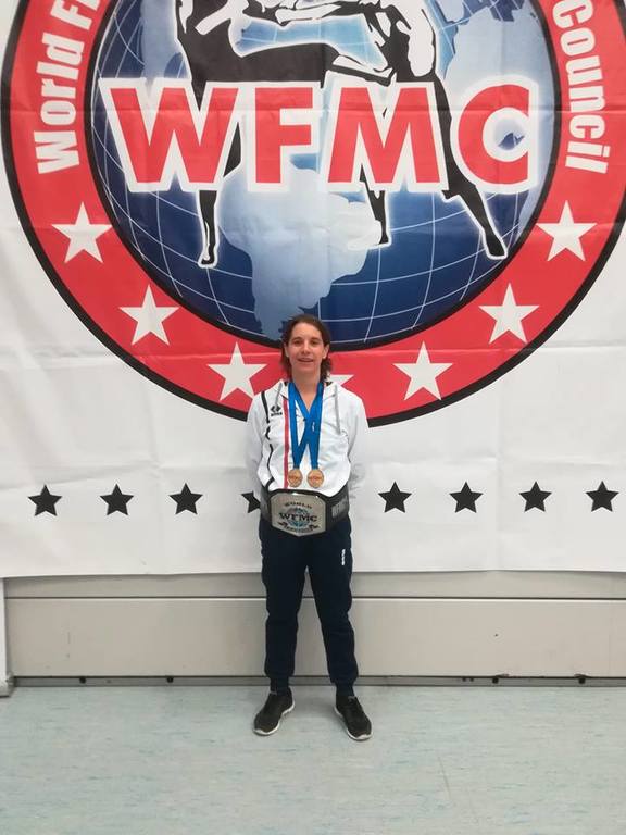 Samedi la compétition concernait les adultes dans les disciplines sur tatamis et sur ring, dont du Pancrace, du Full Contact, du Muay Thai…. Stéphanie s’était inscrite dans les 3 disciplines possibles pour les vétérans. Elle perd de peu les finales en point fighting face a une danoise et en light contact contre une française plus engagée et gagne en kick light contre une autre française. Elle est donc revenue dimanche soir, après 12h de route, avec une ceinture de championne du monde Wfmc et 2 deuxième places. Un peu déçue, car elle visait au moins 2 titres, elle repartira si d’autres opens internationaux se présentent, car en plus de la partie sportive, elle affectionne vraiment ces moments partagés avec d’autres passionnés.