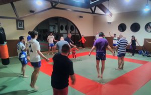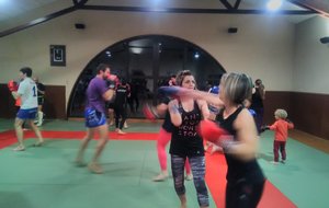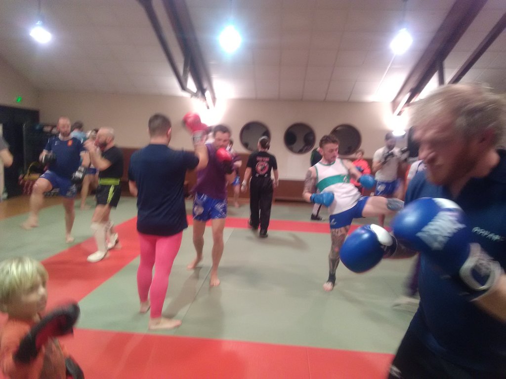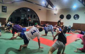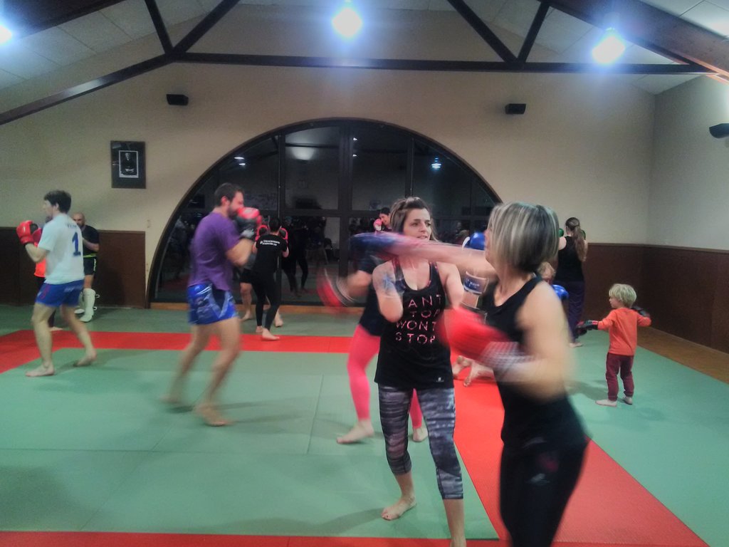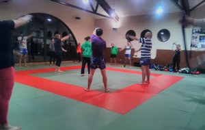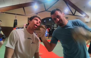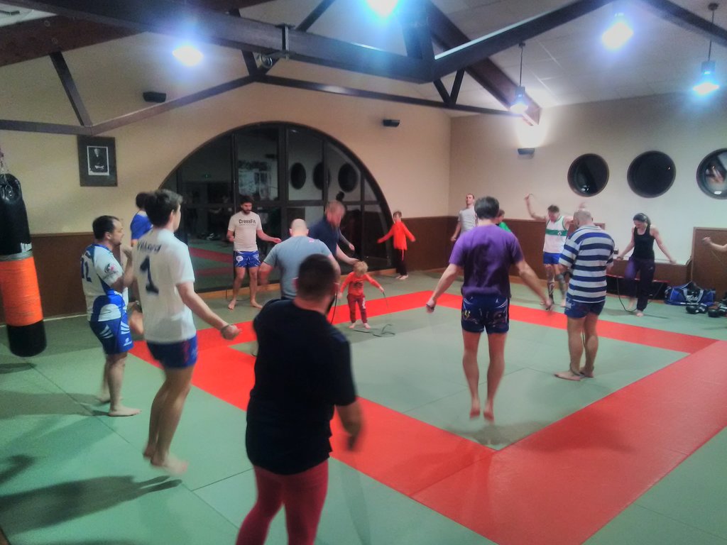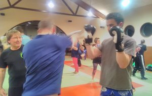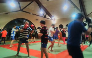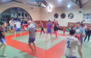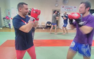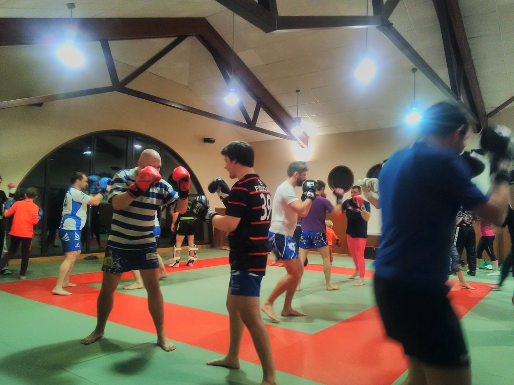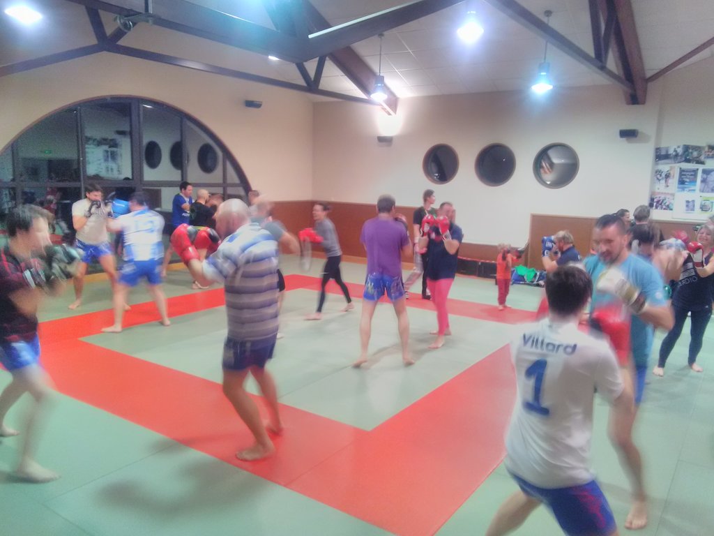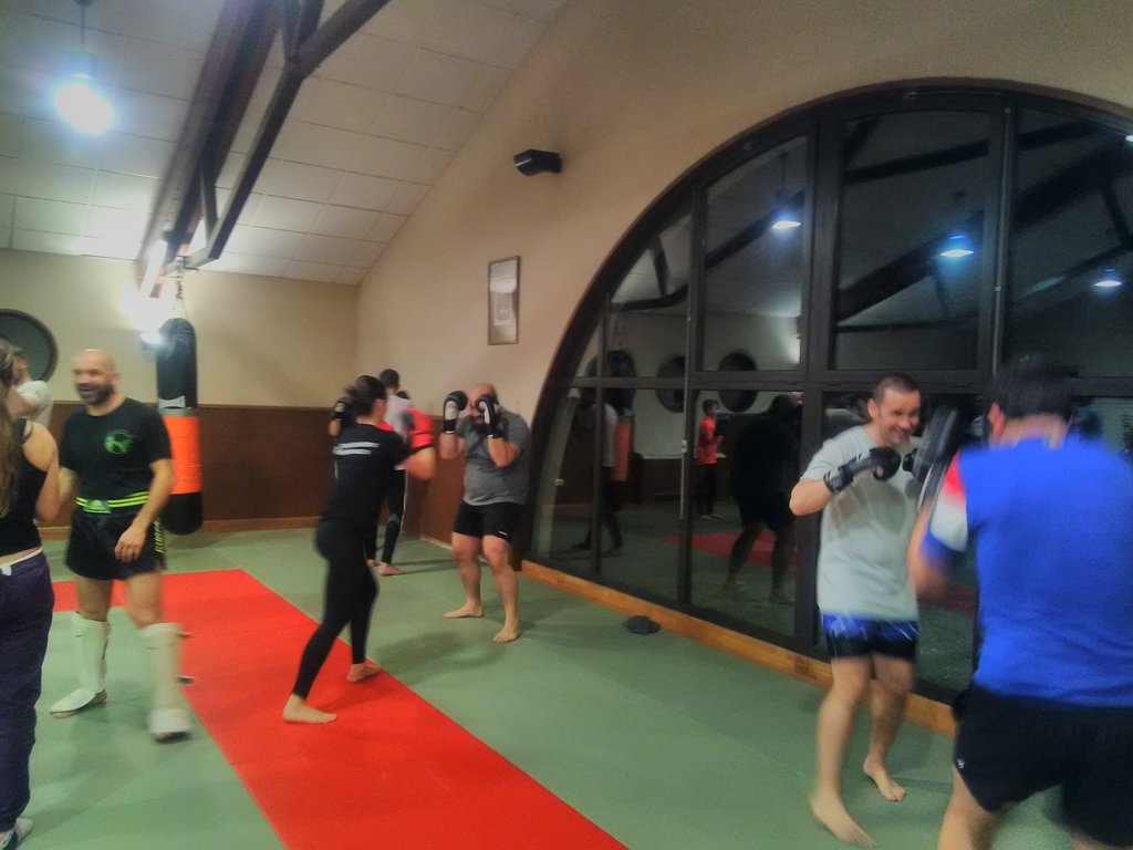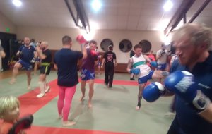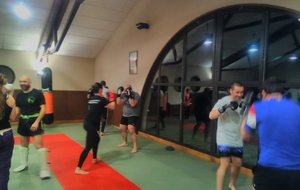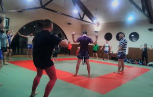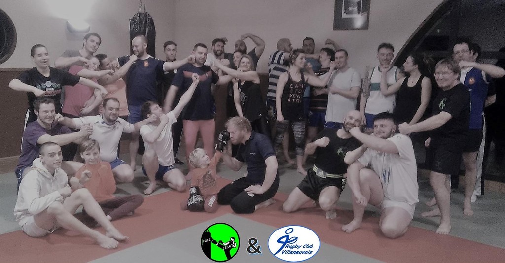 Malgré la fatigue due au match de la veille, où ils ont tout donné, les Seniors du Rugby Club Villeneuvois étaient invités par leurs entraîneurs à une "surprise" (avec conjoint). Arrivés à 19h au stade de Charantonnay, les voilà tous prêts à s'initier au kick boxing avec l'association locale Full & Light. Accueillis par les moniteurs fédéraux et membres du bureau, et après un échauffement et des étirements passifs (suite à l'engagement physique du dimanche), tous s'équipaient d'une paire de gants : les premières techniques de poings et pieds, en ayant toujours la garde, étaient expliquées et testées. Ensuite, la vitesse puis la puissance pouvaient s'exprimer sur les boucliers et paos. Des assauts, toujours dans le fairplay et la bonne humeur, opposition plus libre, finissaient le corps de séance, avant un peu de renforcement musculaire entre autre de la nuque (très sollicité dans les sports d'opposition) et des étirements. La soirée se prolongeait sympathiquement autour d'un verre. Les 2 sections ravies de ce moment trouveront surement d'autres occasions à partager...