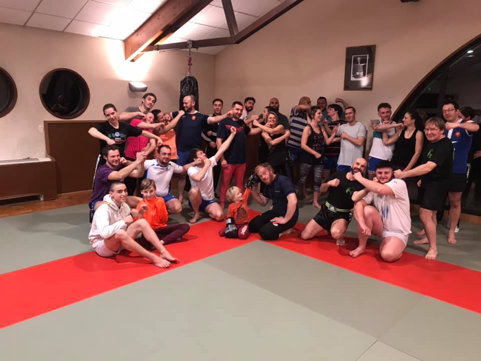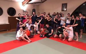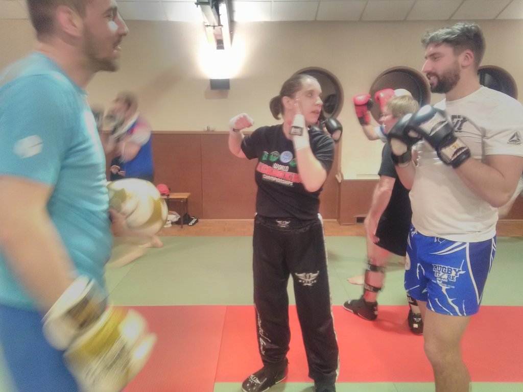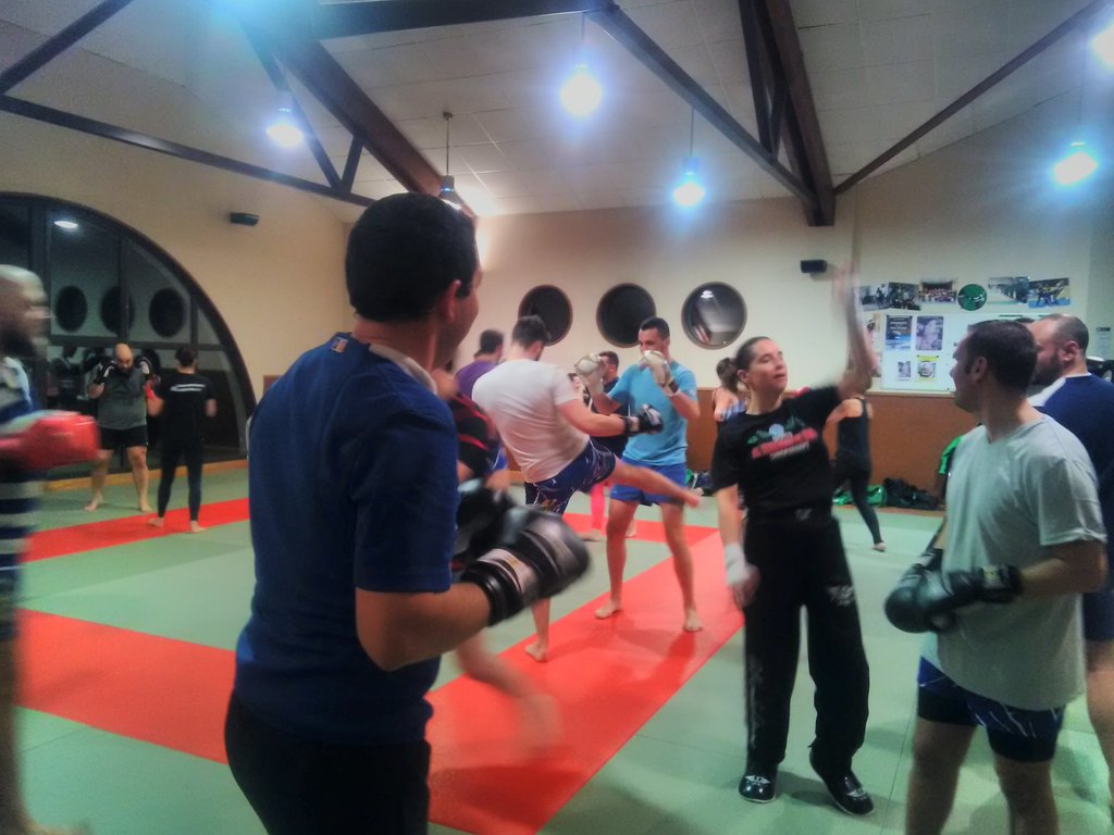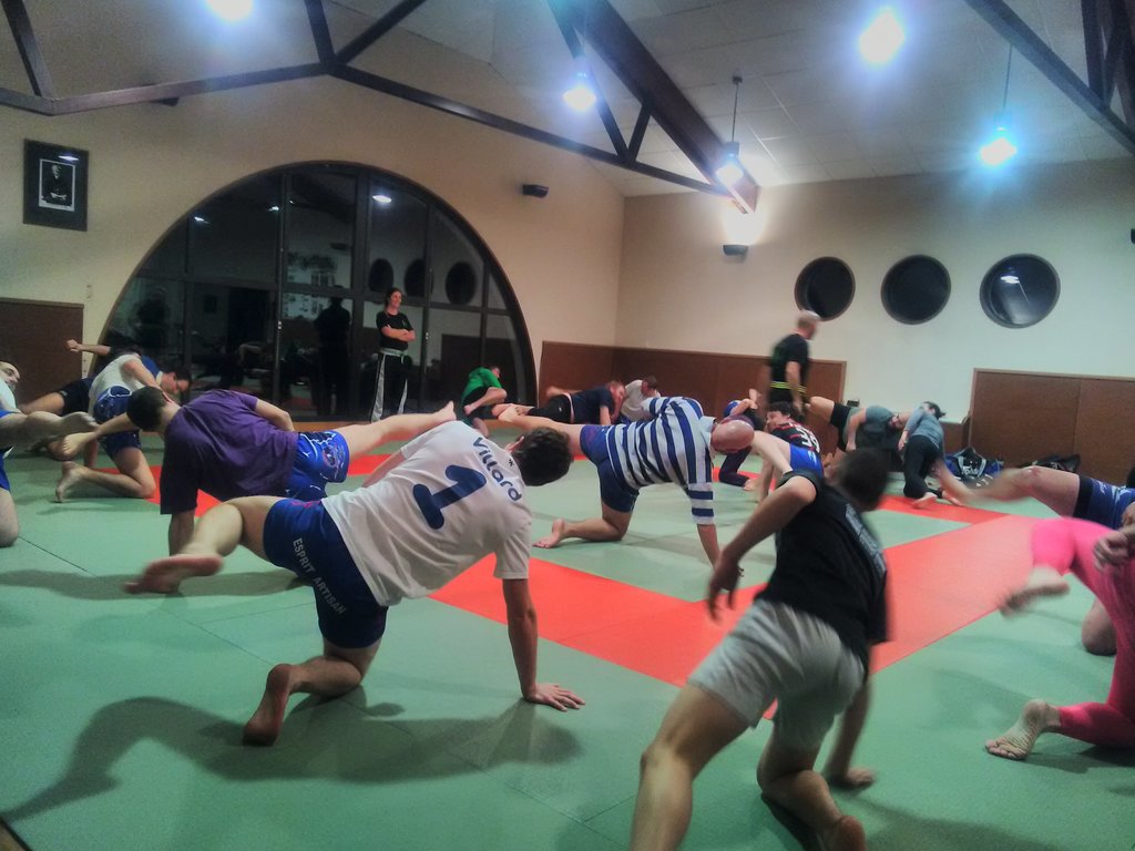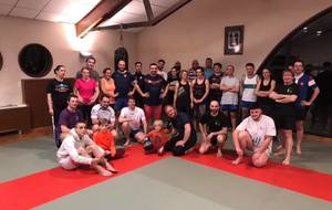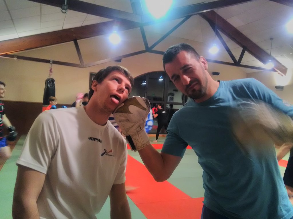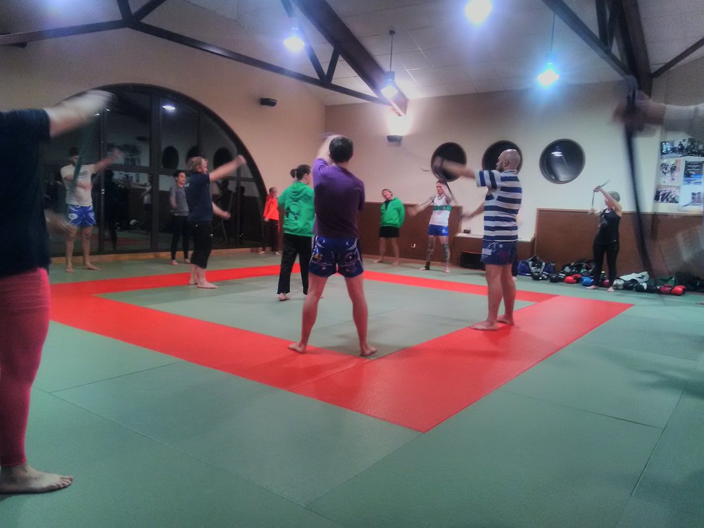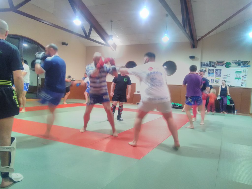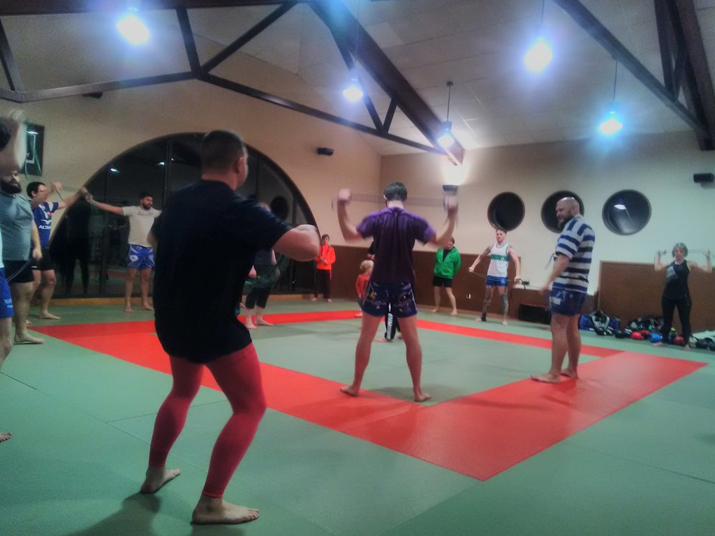 Malgré la fatigue due au match de la veille, où ils ont tout donné, les Seniors du Rugby Club Villeneuvois étaient invités par leurs entraîneurs à une "surprise" (avec conjoint). Arrivés à 19h au stade de Charantonnay, les voilà tous prêts à s'initier au kick boxing avec l'association locale Full & Light. Accueillis par les moniteurs fédéraux et membres du bureau, et après un échauffement et des étirements passifs (suite à l'engagement physique du dimanche), tous s'équipaient d'une paire de gants : les premières techniques de poings et pieds, en ayant toujours la garde, étaient expliquées et testées. Ensuite, la vitesse puis la puissance pouvaient s'exprimer sur les boucliers et paos. Des assauts, toujours dans le fairplay et la bonne humeur, opposition plus libre, finissaient le corps de séance, avant un peu de renforcement musculaire entre autre de la nuque (très sollicité dans les sports d'opposition) et des étirements. La soirée se prolongeait sympathiquement autour d'un verre. Les 2 sections ravies de ce moment trouveront surement d'autres occasions à partager...