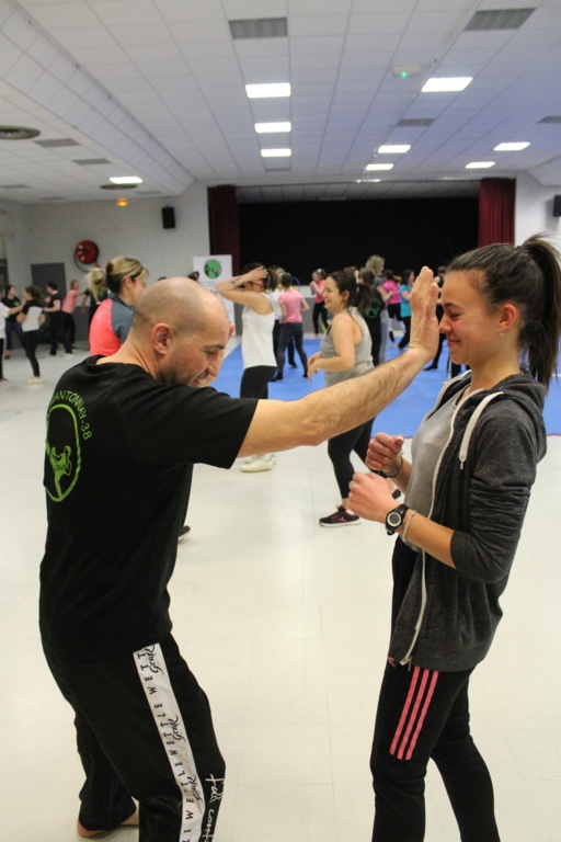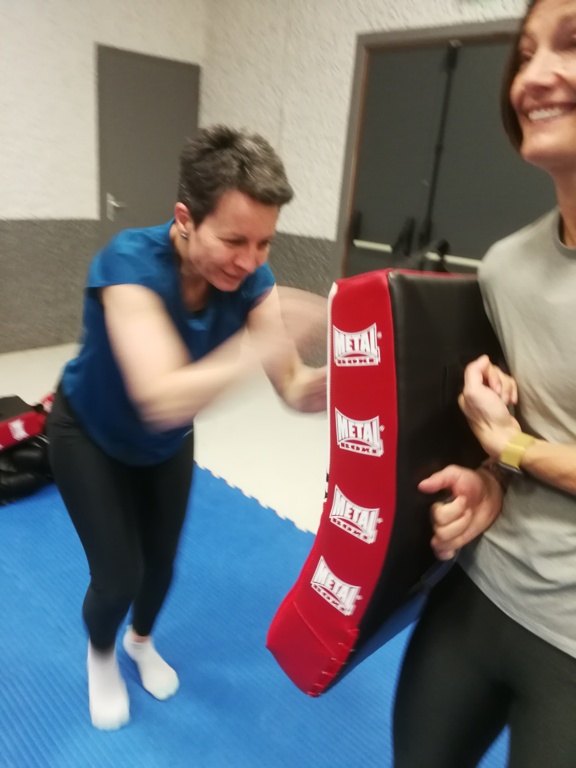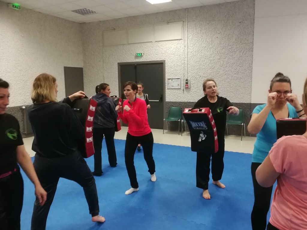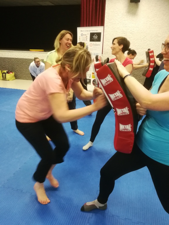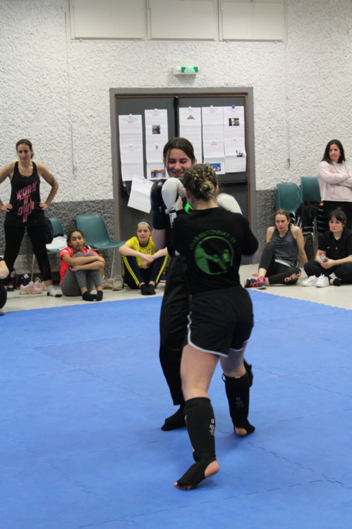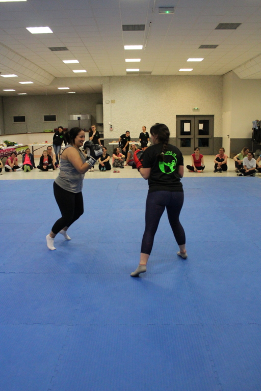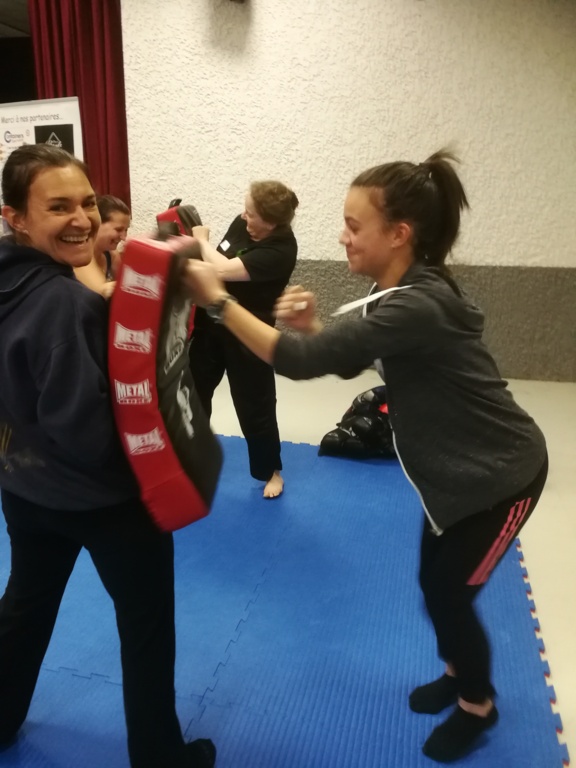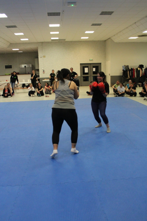Après une présentation rapide par le président, et un échauffement commun encadré par un des éducateurs, 2 groupes se formaient : certaines découvraient, via des ateliers encadrés par des adhérentes et différents accessoires le kick boxing avec la gestion de distance, les directs et crochets, et envoyaient des coups de pied de face, circulaires ou croissants. Les autres appréhendaient les bases de la self défense, axé d’une part sur comment éviter le conflit, et d’autre part comment s’en sortir, voir neutraliser l’agresseur.