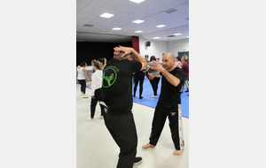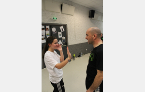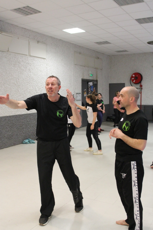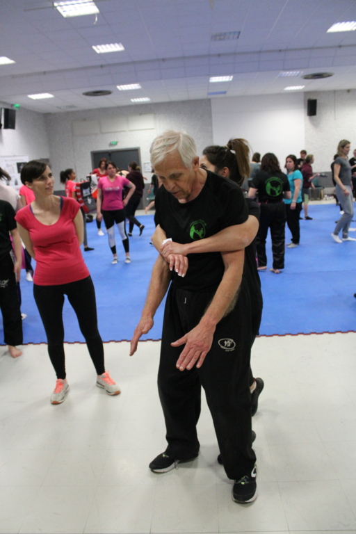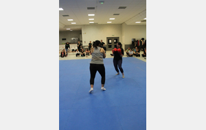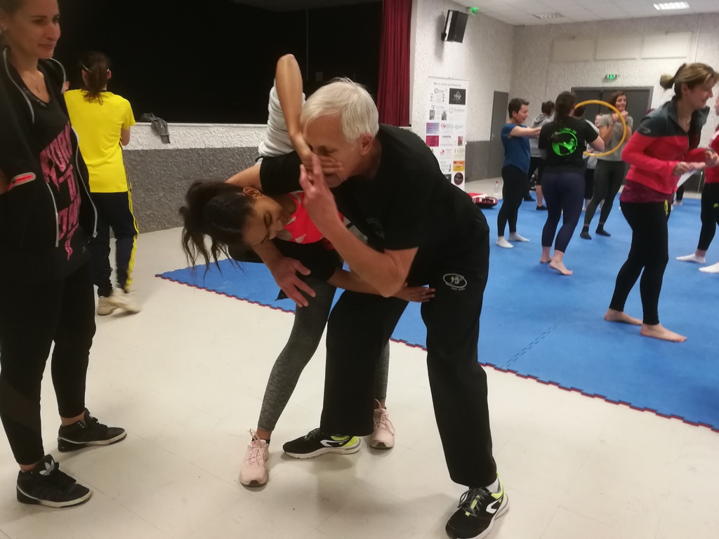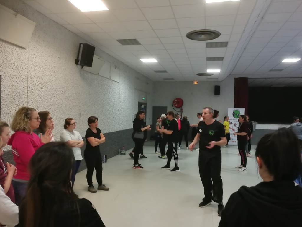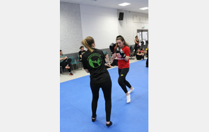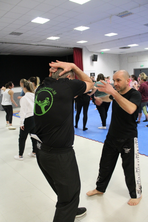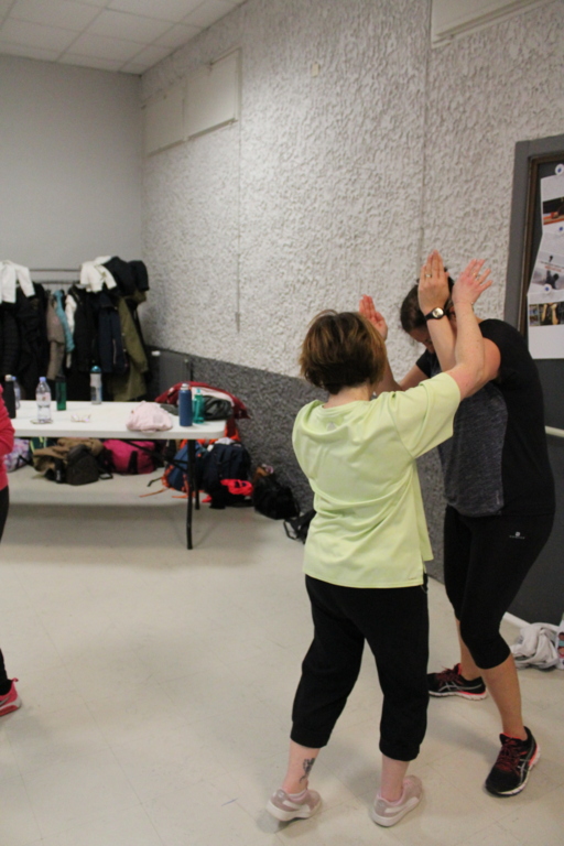Après une présentation rapide par le président, et un échauffement commun encadré par un des éducateurs, 2 groupes se formaient : certaines découvraient, via des ateliers encadrés par des adhérentes et différents accessoires le kick boxing avec la gestion de distance, les directs et crochets, et envoyaient des coups de pied de face, circulaires ou croissants. Les autres appréhendaient les bases de la self défense, axé d’une part sur comment éviter le conflit, et d’autre part comment s’en sortir, voir neutraliser l’agresseur.